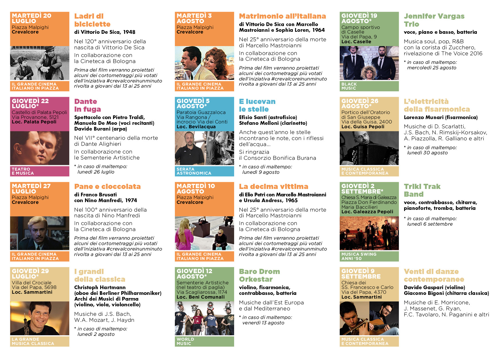 In collaborazione con la Cineteca di Bologna verranno proiettati alcuni capolavori del cinema italiano in occasione di alcune ricorrenze: Nino Manfredi (100 anni dalla nascita), Marcello Mastroianni (25 anni dalla morte) e Vittorio De Sica (120 anni dalla nascita). All’inizio di ogni serata verranno proiettati i cortometraggi più votati sul canale Youtube del Comune, realizzati nell’ambito dell’iniziativa #crevalcoreinunminuto e rivolta ai giovani tra 13 e i 25 anni.