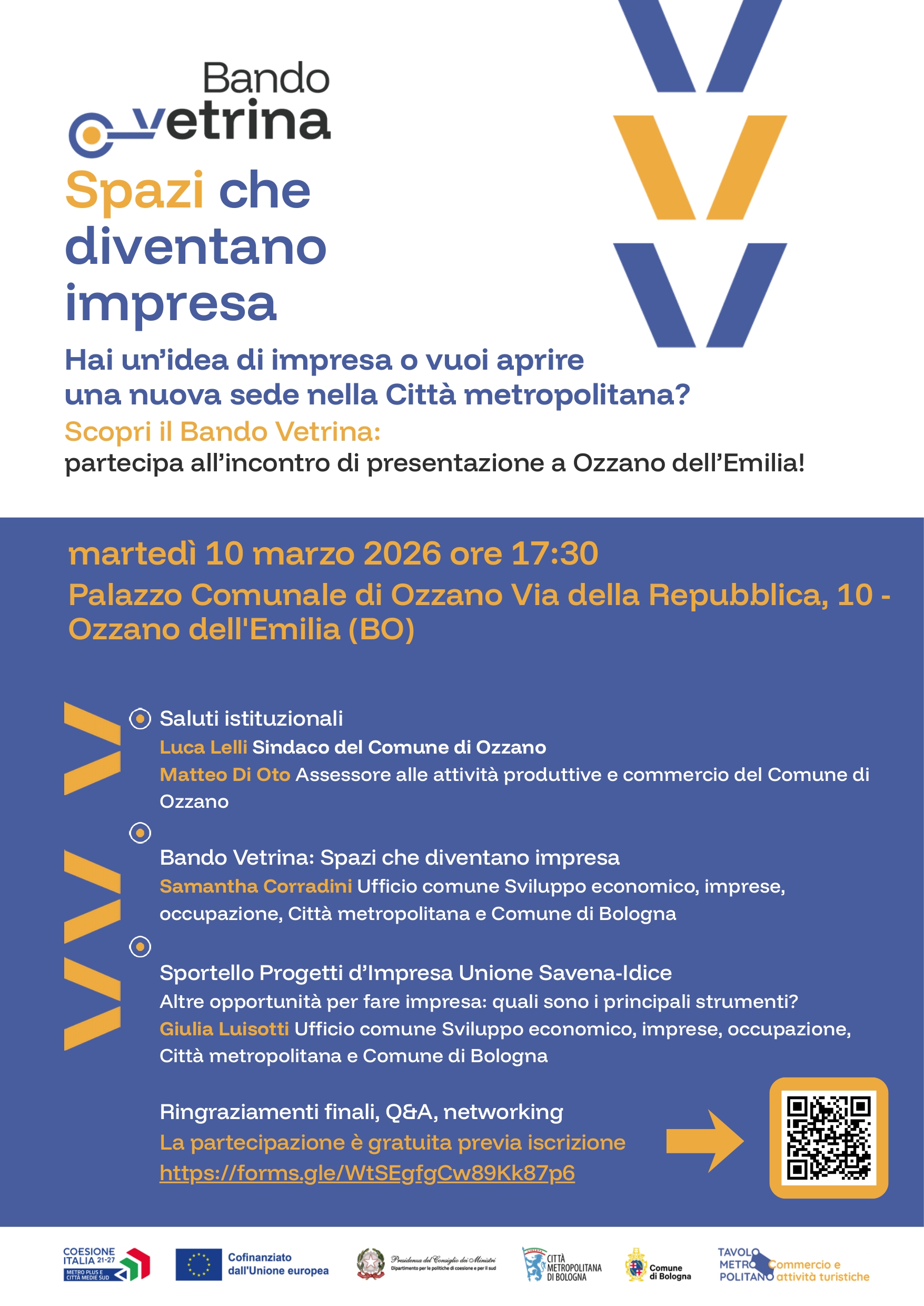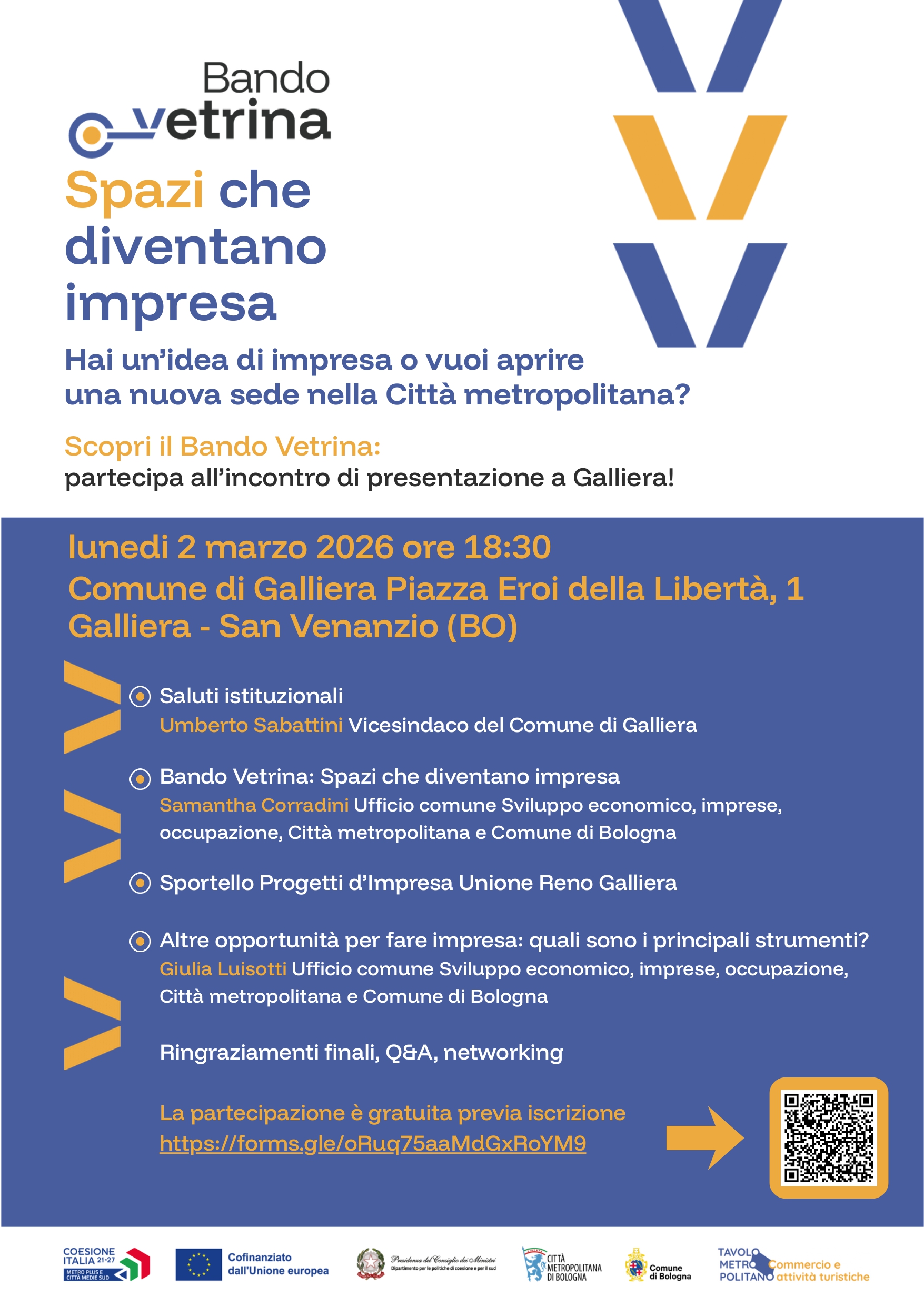 Un'occasione per scoprire i vantaggi offerti dal Bando Vetrina, rivolto a aspiranti imprenditori e imprenditrici e micro e piccole imprese già costituite. Il bando è dedicato soprattutto a coloro che desiderano avviare una nuova attività nel territorio della Città metropolitana di Bologna (nei settori del commercio, dell’artigianato, dell'artigianato artistico, dell’artigianato di servizio e dei pubblici esercizi) con un’idea capace di generare valore economico, sociale e urbano, contribuendo a rendere i contesti locali più attrattivi, vivibili e sicuri.